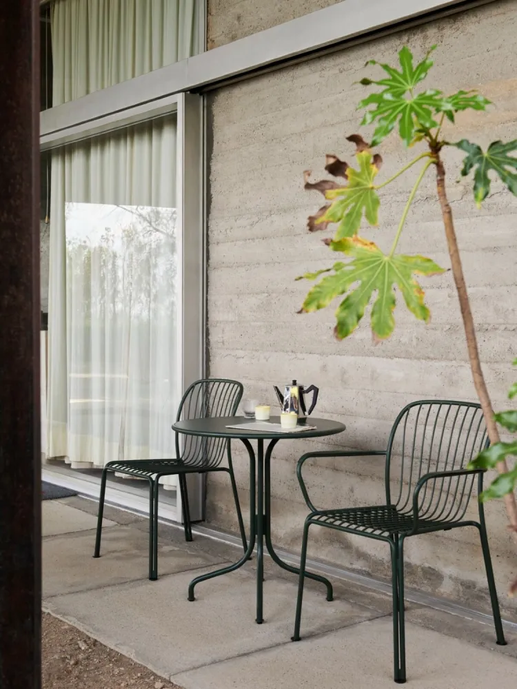 Materiali: TABLETOP Solid porcelain with high-gloss glaze on top and edge. STELO Steel tube with outdoor powder coating. BASE Water-based lacquered concrete with exposed aggregate finish.