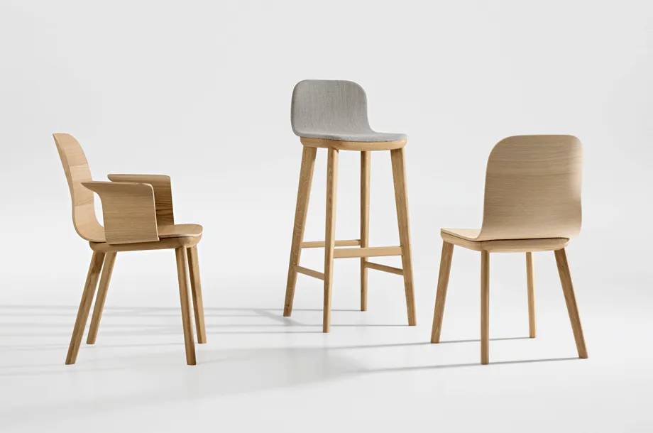 Materiali: Base in legno massiccio. Il sedile è costituito da un'anima in MDF con schiuma HR o CMHR e rivestito con un tessuto sfoderabile con cerniere o con un rivestimento non sfoderabile in pelle.