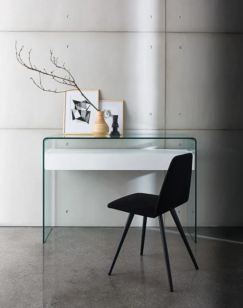 La consolle presenta un piano di vetro che frontalmente viene curvato e scende per 14cm. Ha diverse finiture sia per la struttura che per il piano, il che la rende una consolle elegante ma versatile.