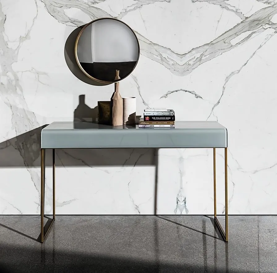 La consolle presenta un piano di vetro che frontalmente viene curvato e scende per 14cm. Ha diverse finiture sia per la struttura che per il piano, il che la rende una consolle elegante ma versatile.