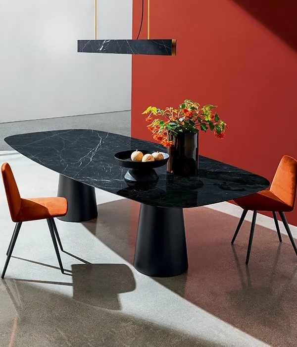 Il tavolo totem presenta due basi in metallo che sostengono un piano (possibile in diverse finiture) dagli angoli smussati che lo fa posizionare a metà tra la definizione di tavolo rettangolare e quella di tavolo ellittico.