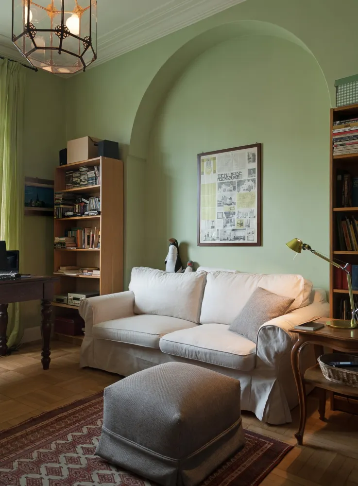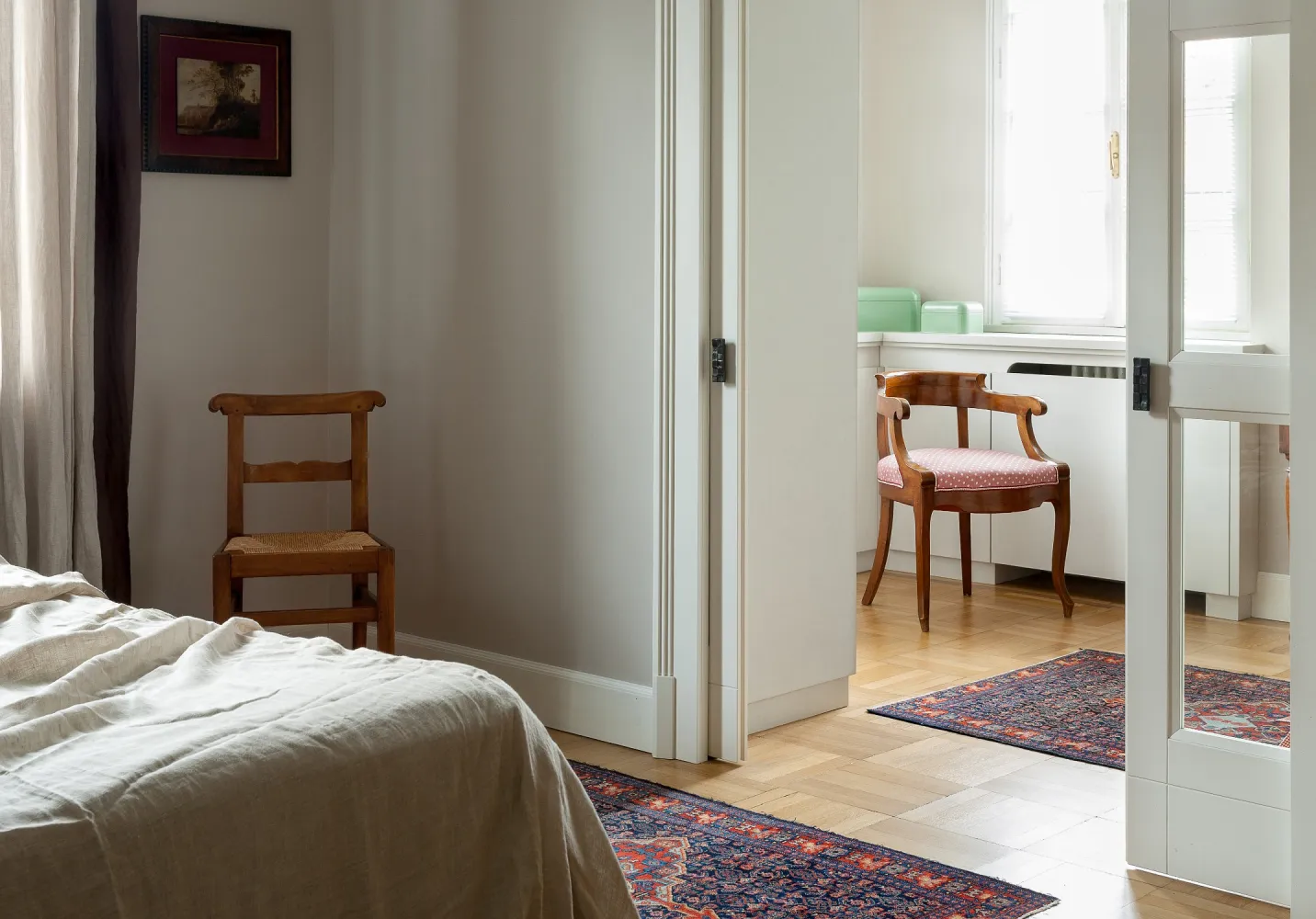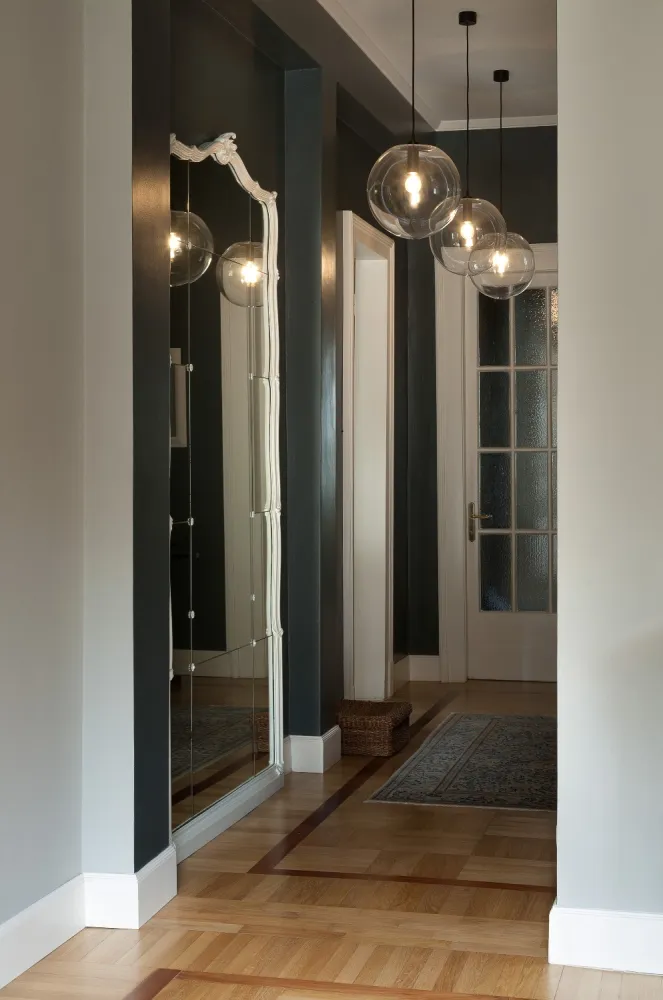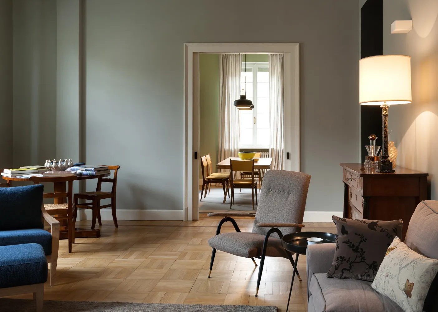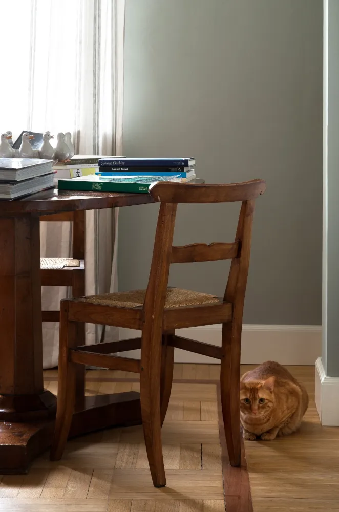 I colori sono freschi, in tonalità leggermente fredde in contrasto con i toni caldi del legno del pavimento e degli arredi in stile.
