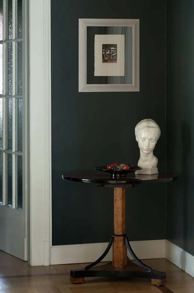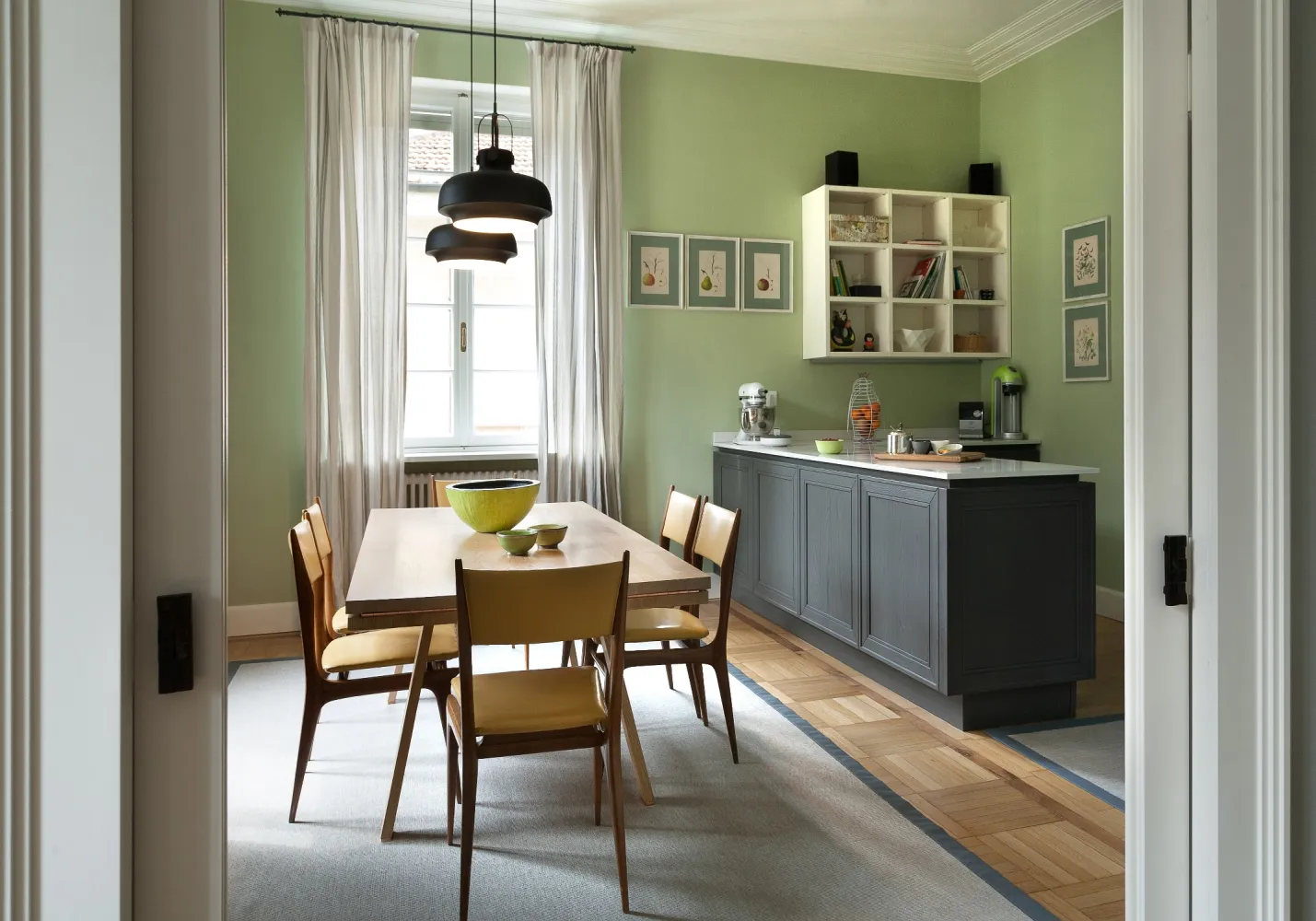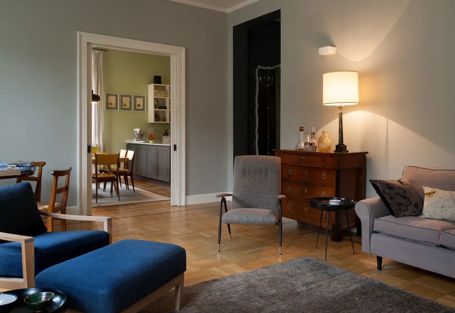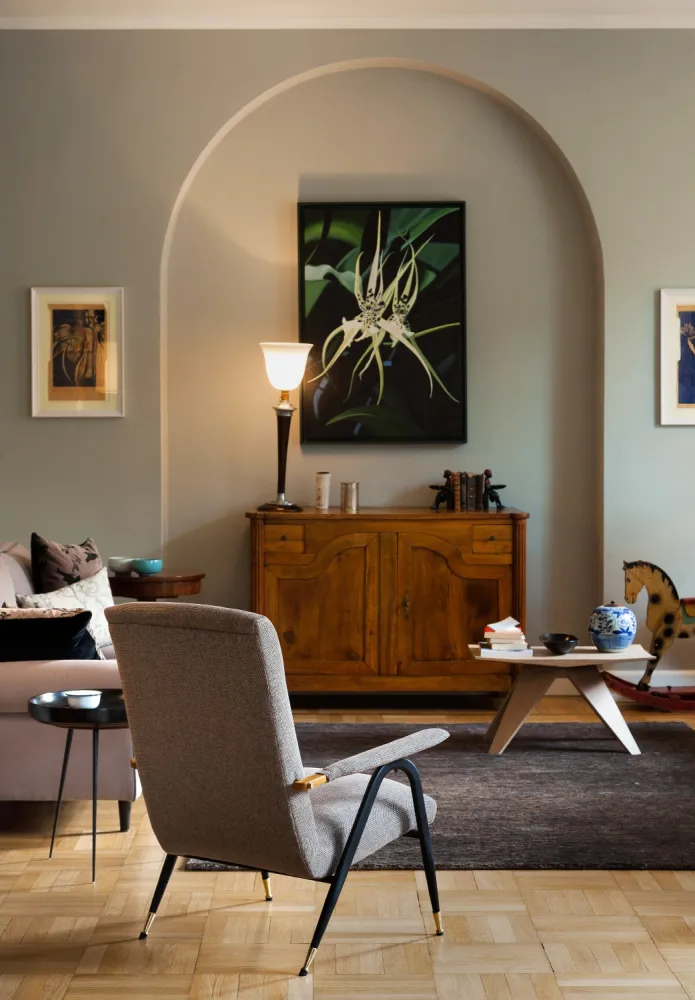 I colori sono freschi, in tonalità leggermente fredde in contrasto con i toni caldi del legno del pavimento e degli arredi in stile.
