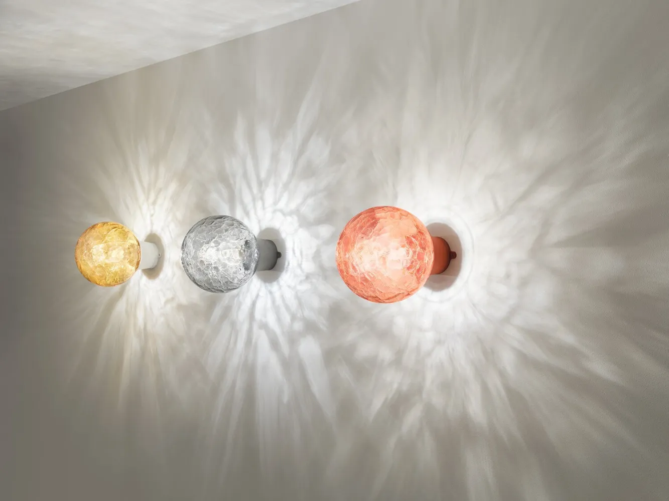 Materiali: Ottone spazzolato con globi di vetro colorato soffiato a mano nei colori rosa, blu o grigio