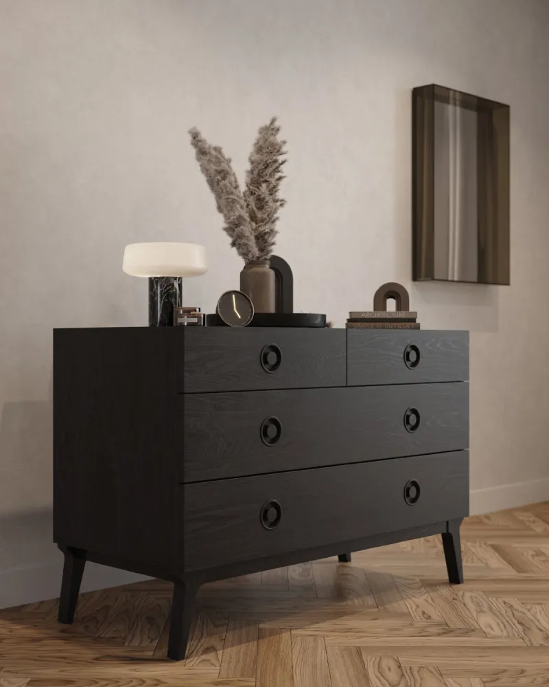 Materiali: Gambe, interni dei cassetti e maniglie in legno massiccio, struttura e frontali in rovere impiallacciato, laccatura poliuretanica trasparente